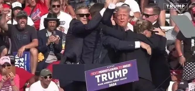 当天下午,特朗普在美国宾夕法尼亚州举行竞选演讲时,现场突然“啪啪”几声枪响,从视频上来看,枪声没有寻常人想像得那么响亮,声音比较沉闷,枪响后特朗普下单识地感到疼痛什么的,摸了摸自己的右耳,此时枪声还在连续响起,特朗普紧急趴在了演讲台下,保安人员一拥而上,彪形大汉们用肉身扑在特朗普身上。